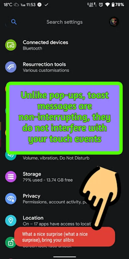 Unlike other popular lyrics apps that shows lyrics in a pop-up which will interrupt your touch events, toast messages do not interfere with your touch events.