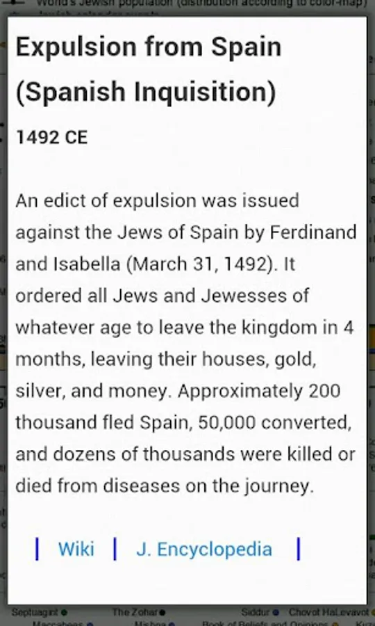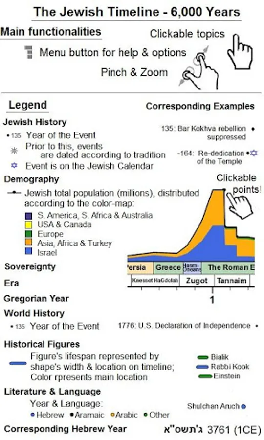 Studying Jewish history and Jewish heritage has never been easier. The interactive timeline presents Israel's history and heritage in a variety of areas, from the creation of the world to our days. A click on any topic in the timeline will open a window with a brief explanation and links to additional sources. The application combines the history of the Jewish people along with the world's, Jewish demography, immigration, empires, periods, historical figures, leaders, literature and languages. Combining the different subjects and including both "traditional" and "secular" topics, allows the user to see the whole picture. This way, you can learn the story of the Israeli nation from every point in time and learn about the correlations between the topics. This tool makes it easy and enjoyable to learn and remember who the Jewish People are.
