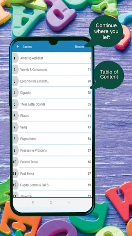 • Select the chapter on the content page you want to study or press the Resume button to go where you left off last time