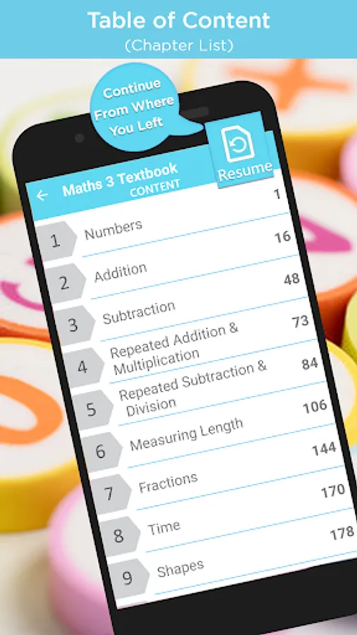 • Select the chapter on the content page you want to study or press the Resume button to go where you left off last time
