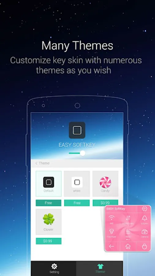 The most nice-looking themes: Dozens of themes could be chosen. You can also set the size and opacity of the floating button. With simple and clean style of Material Design, it offers you a different mood.