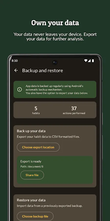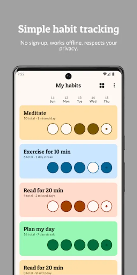 Your data never leaves your device as Habit Builder stores everything locally. The app works without an internet connection and you never need to create an account or share your data.