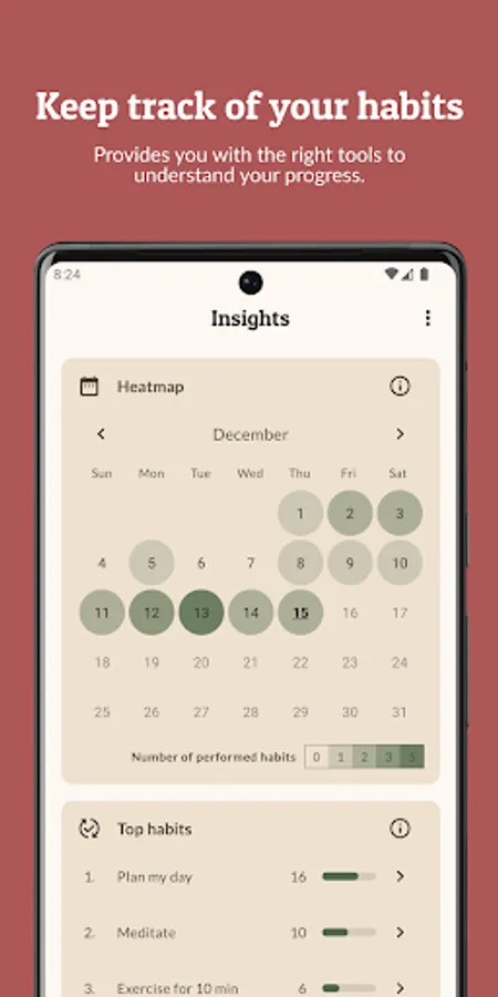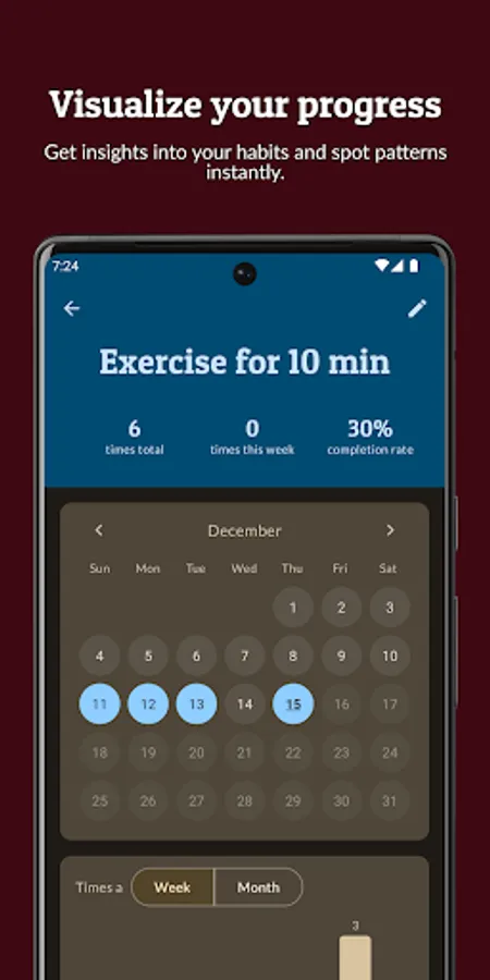 Get insights into your habits and spot patterns instantly. Habit Builder keeps track of your most successful habits, the most active day for each habit, and other useful statistics.