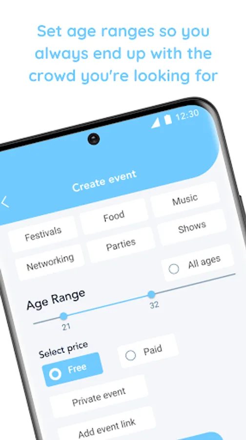 SET AGE RANGES: Set age ranges for each of your events to make sure that only the people you want will see the event. Event open to anyone? Just tap “All Ages!”