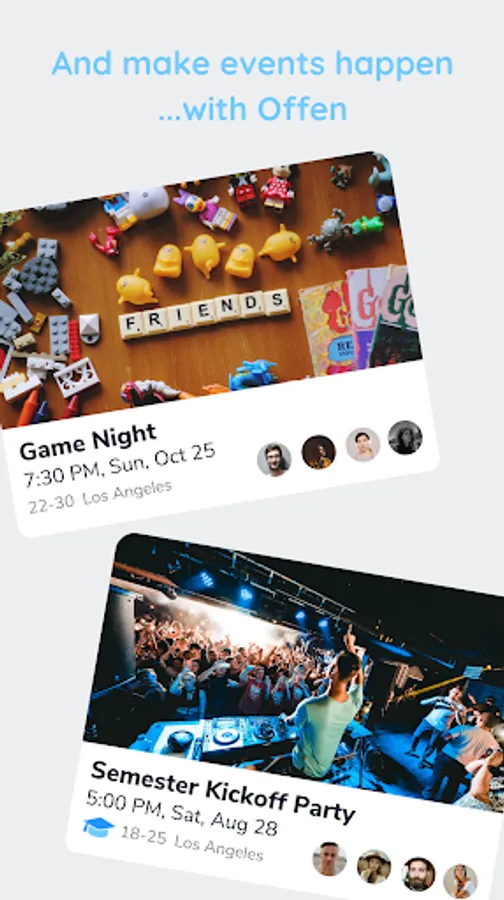 EVENTS ARE ANYTHING YOU WANT THEM TO BE: What are you looking to do? Throw a party, play sports, host a video game tournament, or do just about anything else you can think of! Make friends through Offen and enjoy!