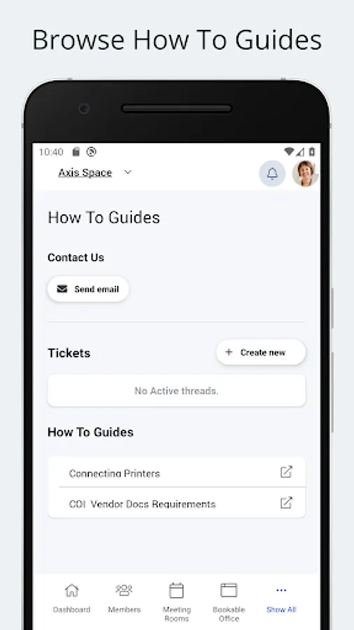 Support Requests – Submit service requests or contact the Axis Space team directly through the app.