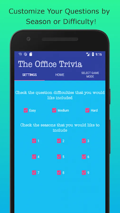 Mix and match difficulties and seasons to your liking! Only want to be asked questions from the first two seasons? Are you a die hard fan and don't want any easy questions? Well now you can do that with this completely customizable trivia experience!