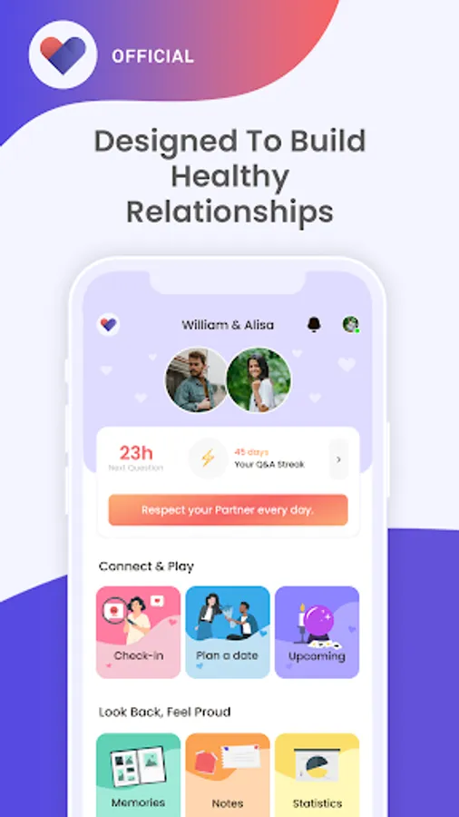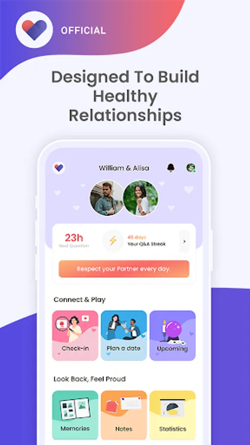 These features allow you to connect with your partner whether in the same city or in a long-distance relationship. Official can be used as an outlet for advice to deepen your relationship and help you create life-lasting experiences with the ones you love most.
