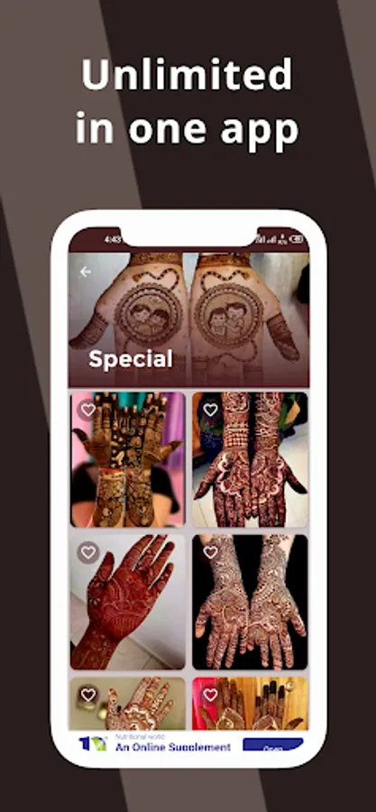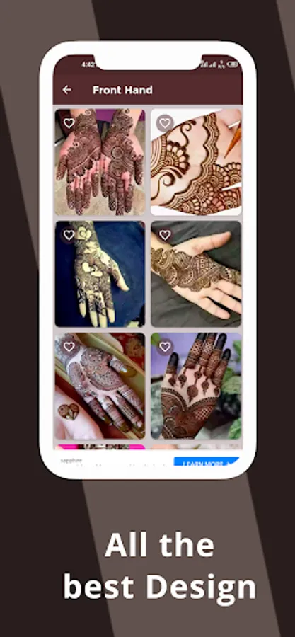 This app contains Mehndi Designs completely offline such as Bridal Mehndi Designs, Eid Mehndi Designs, Diwali Mehndi Designs all Trending Designs of Indian and Pakistani Mehndi ,Finger Mehndi Designs, Kids Mehndi Designs, Back hand Mehndi Designs ,Arab Mehndi. Diffrent categories like Hand Designs, Foot Designs ,Henna Mehndi And tattoos, Henna Patterns.