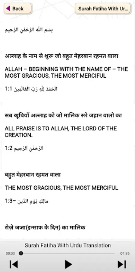 Al-Fatiha, is the first surah of the Quran. It consists of 7 ayah which are a prayer for guidance and mercy. Al-Fatiha is recited in Muslim obligatory and voluntary prayers, known as salah. Surah Fatiha in audio with translations in Hindi ,English, Arabic.no Internet need to read it.
