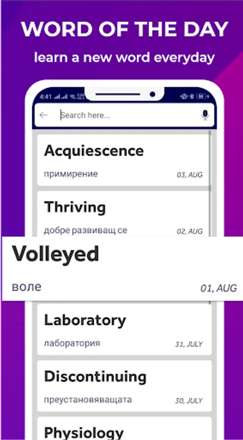 This app bulgarian dictionary helps in building your vocabulary by daily words meaning, word of the day alerts. You can find words and track them for learning. you can practice word learning by playing word quiz games. Audio pronunciation tool help in listening correct sound of words.
