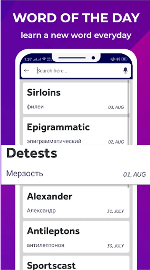 This app russian dictionary helps in building your vocabulary by daily words meaning, word of the day alerts. You can find words and track them for learning. you can practice word learning by playing word quiz games. Audio pronunciation tool help in listening correct sound of words.