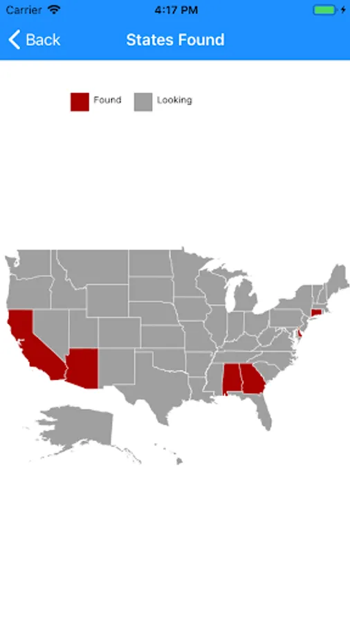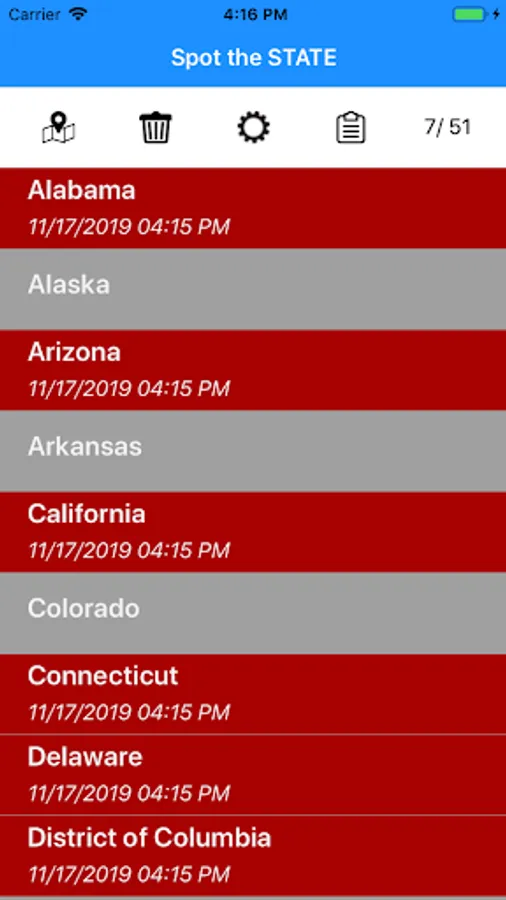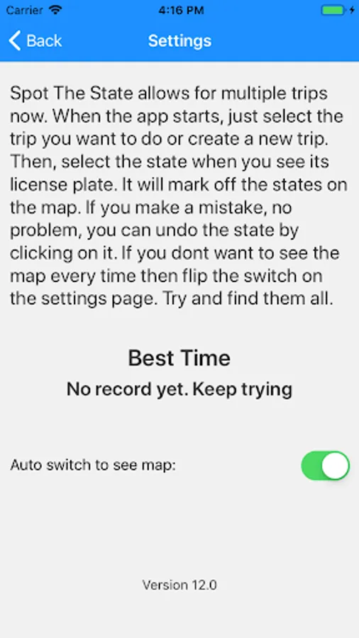 This app provides hours of fun for the whole family when traveling. All you have to do is spot the license plate and tap the list of states for that plate. If you make a mistake, just click the state again and remove it. As you find a state it will how you the map of the US along with how many found. To start a new game, just reset game from the top or add another trip.