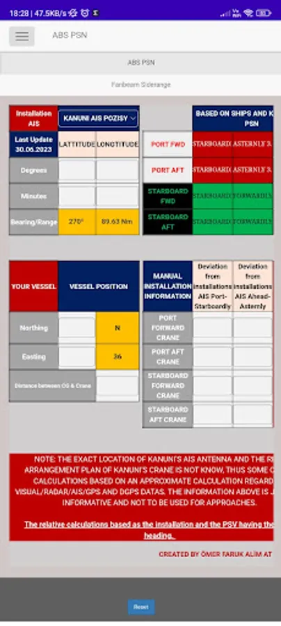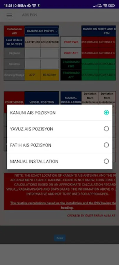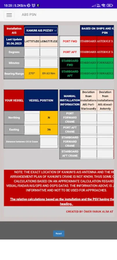 -ABS PSN: To calculate distance and bearing of an installation and a vessel. The tool currently working in 36-T UTM Coordinates only. Might be changed in the future as per users requestion.