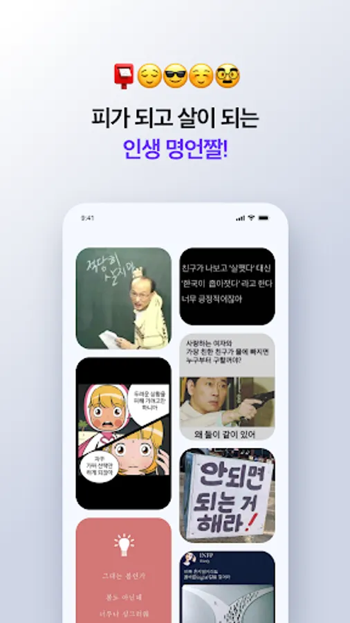 The fun jalbang app provides jal images spread all over the internet world. Directly selected (?) cute memes, life quotes, community humor, memes more faithful to emotional expression than emoticons, and MBTI information.