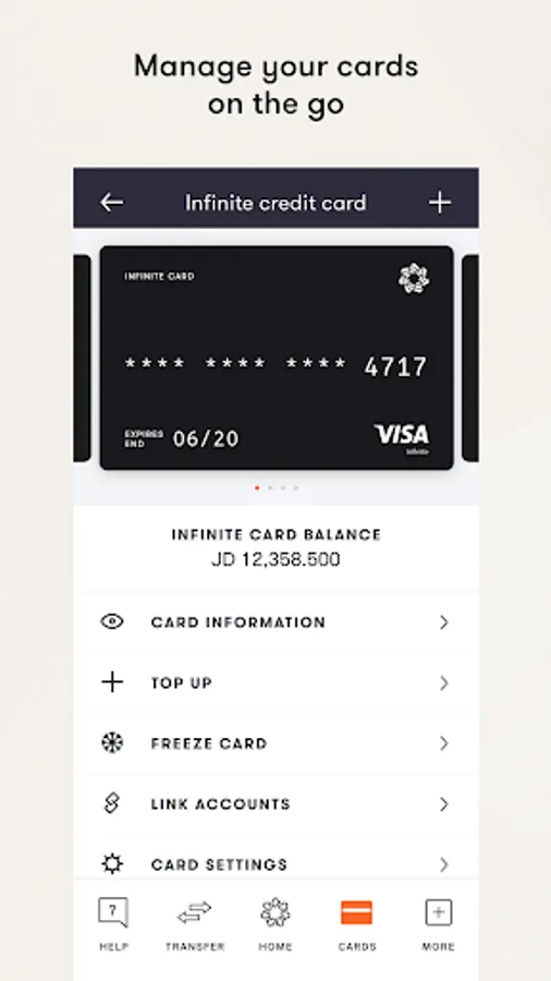 - Control your debit and credit cards (order, set up limits, freeze/unfreeze, etc.)