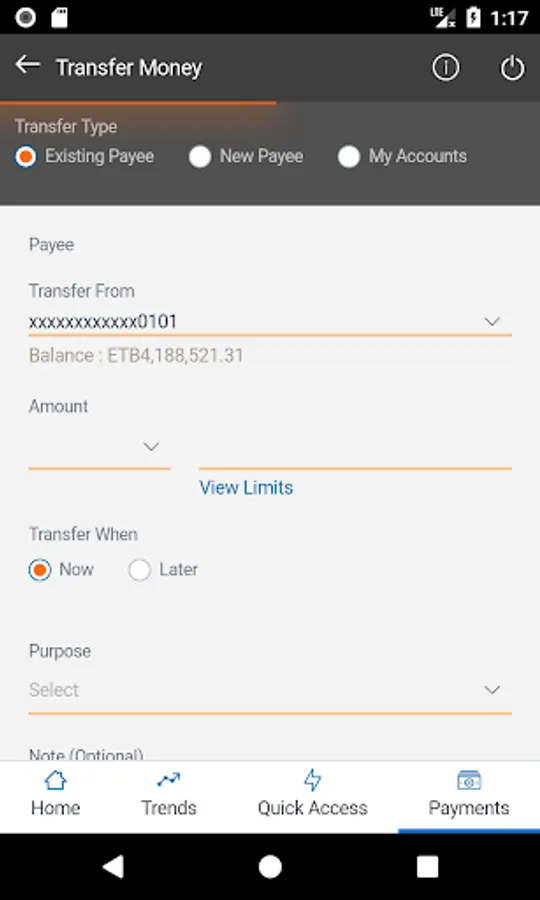 Payment between Self Accounts, Internal Bank Account and Peer to Peer Payment for Local Ethiopia Mobile Number.