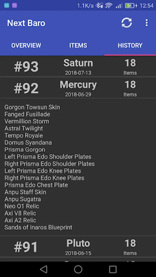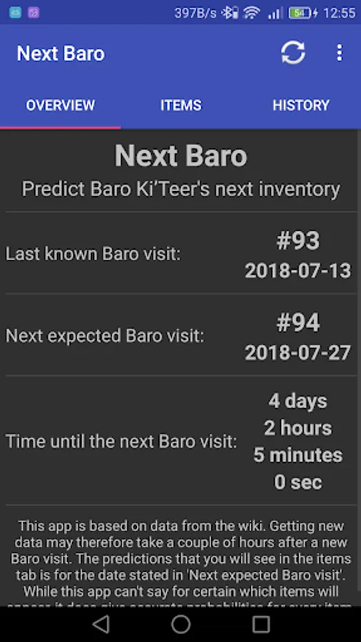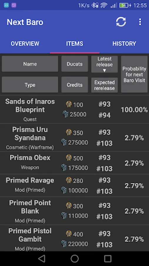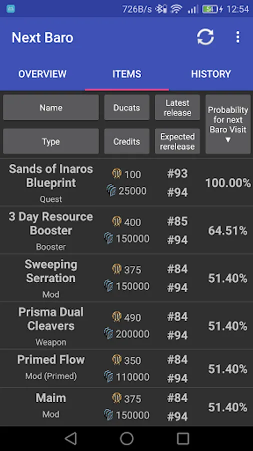 This app creates a list of all items that Baro has ever sold and uses an algorithm to calculate how likely an item is to appear in his next inventory. Each item in the list has a percentage that tells you how likely the item is to be in the next one. It also tells you when the item is MOST likely to be sold again.
