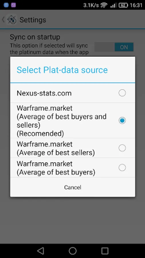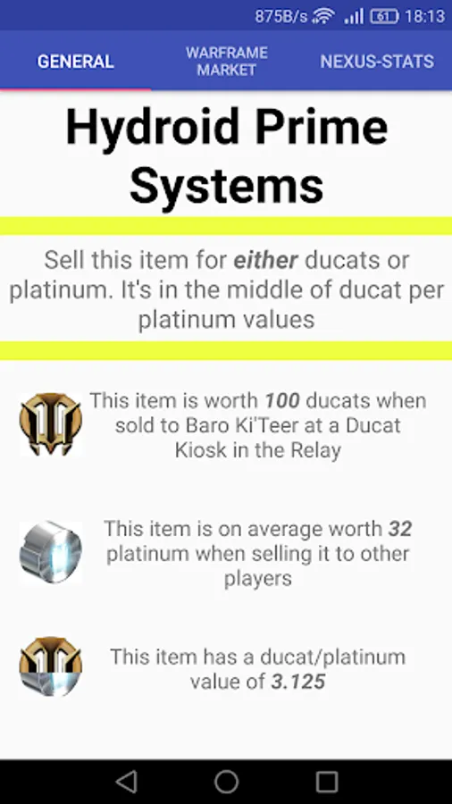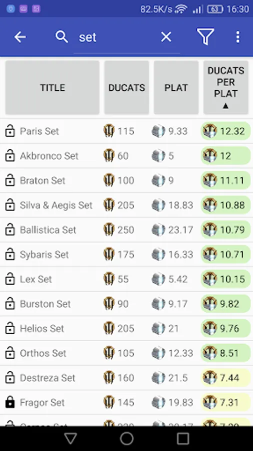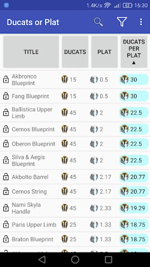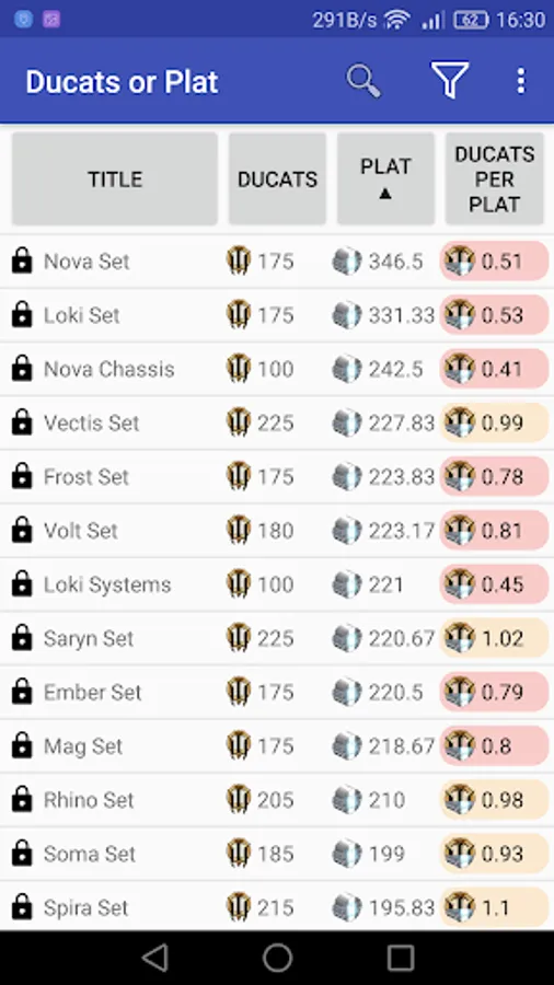 The app also allows you to sort the list of items based on their name, ducat price, platinum price or "ducats per plat"- value.