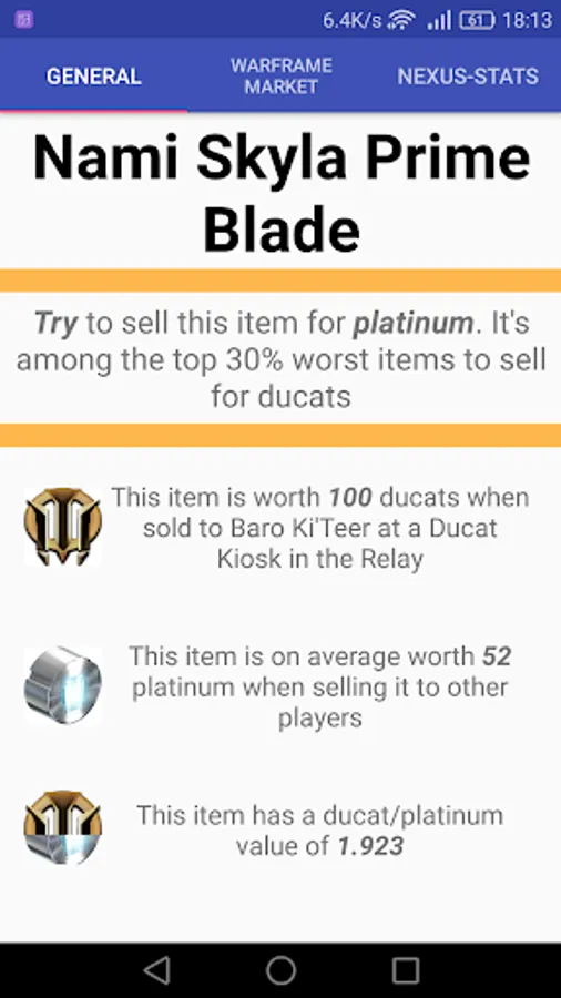 This app uses the current platinum price and the ducat price of all prime-parts in Warframe to tell you which currency you should sell your items for. It does this by generating a "ducats per plat"- value for all items. A high "ducats per plat"- value means sell the item for ducats, a low value means sell it for platinum.