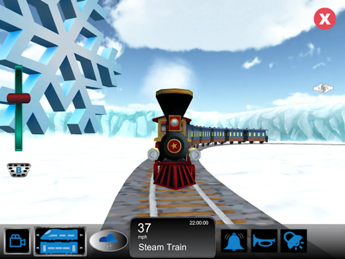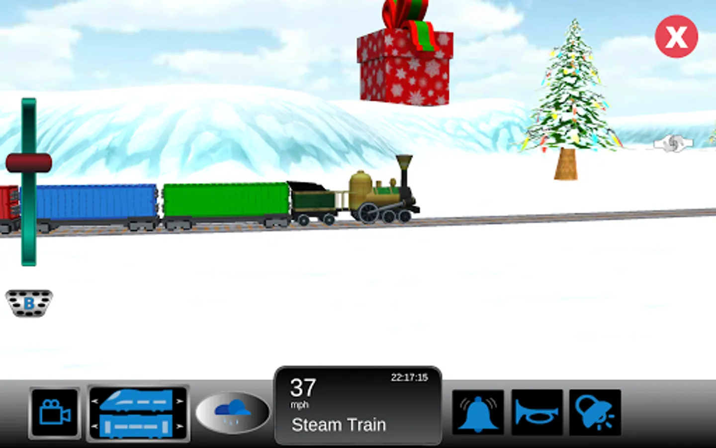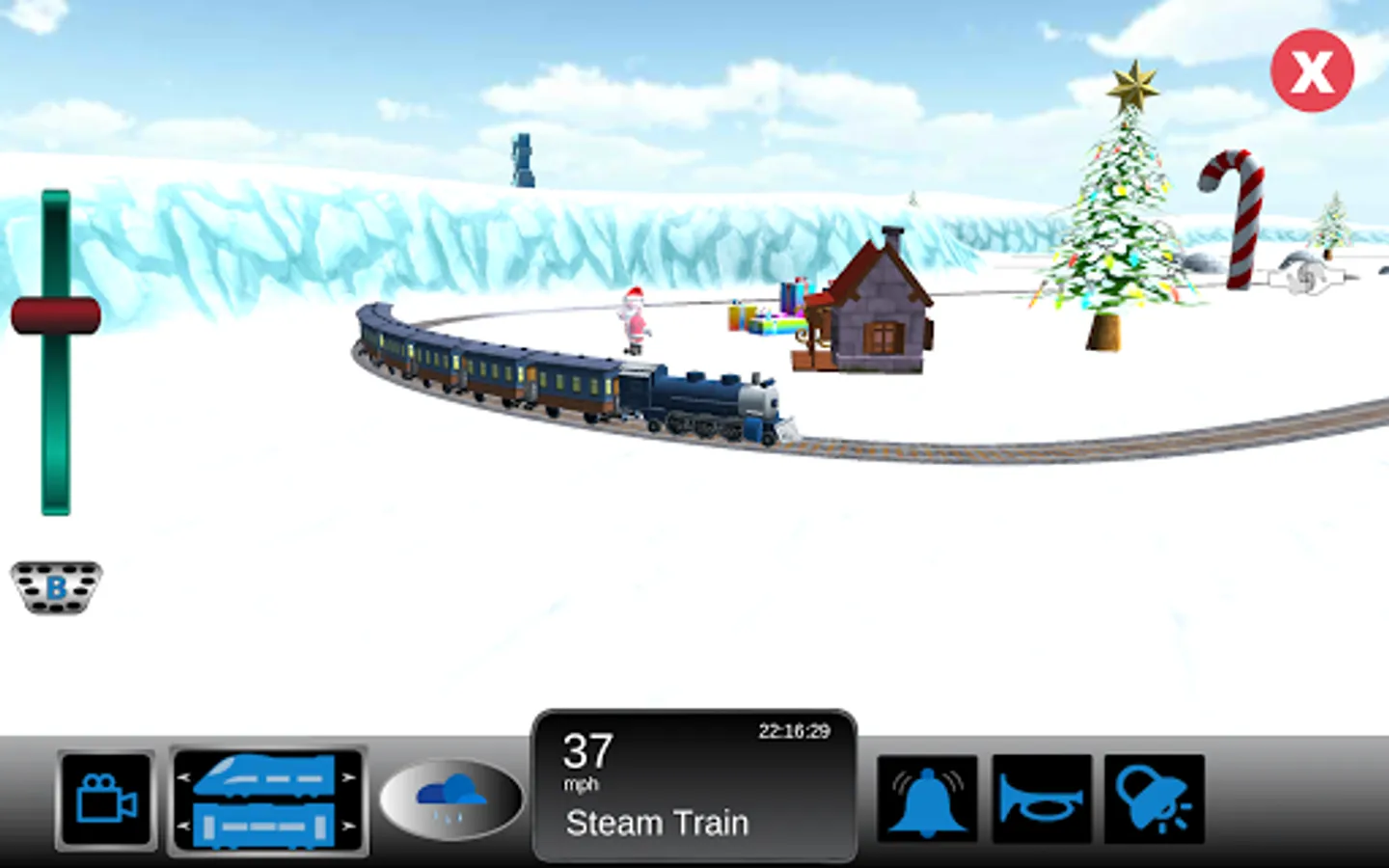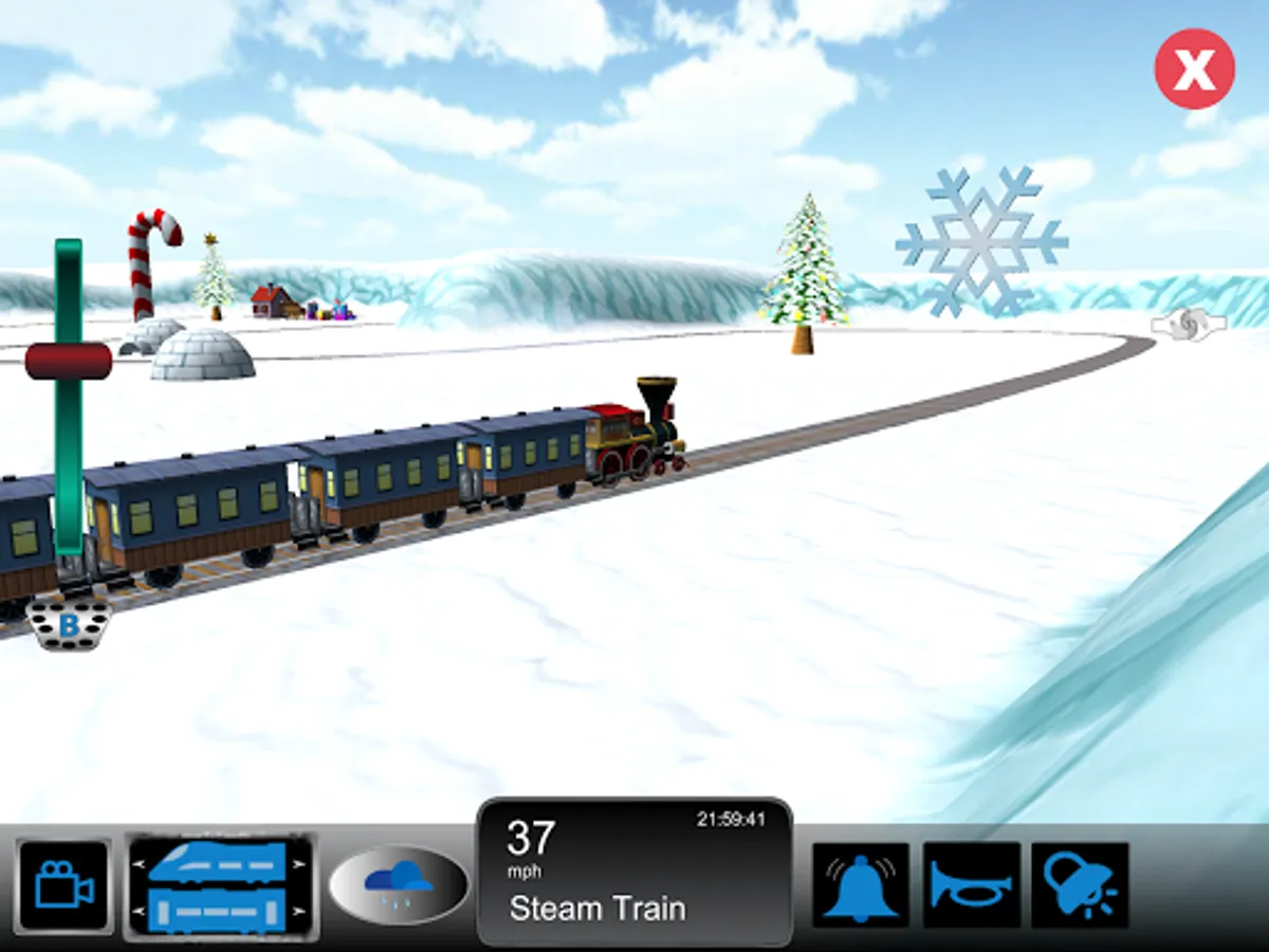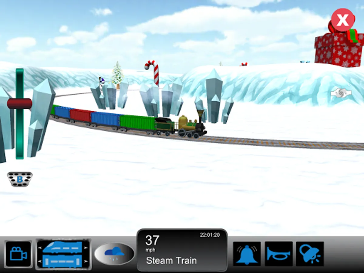 Christmas Trains is a Train Simulator for kids set in a Christmas themed scene. Kids can control a train as it goes around magical world that includes Snowman, Christmas Trees, Presents and most importantly Santa.