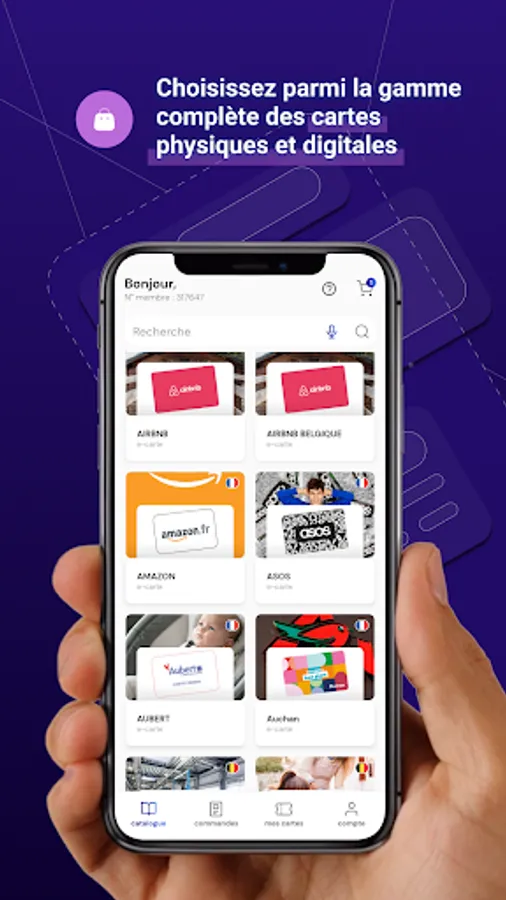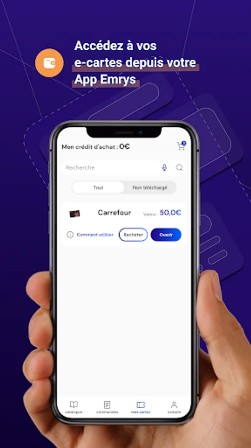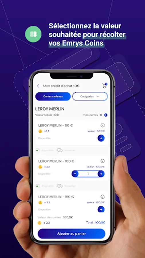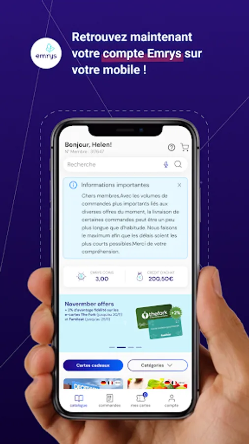 With the Emrys application, check your Emrys Coins and your purchase credit in real time. Choose your favorite brand from the full range of physical and digital cards and select the desired value to collect your Emrys Coins! You will be able to find all your orders and access your e-cards directly from your App! No need to print the cards anymore, present your mobile directly in the store, or use your cards on the web!