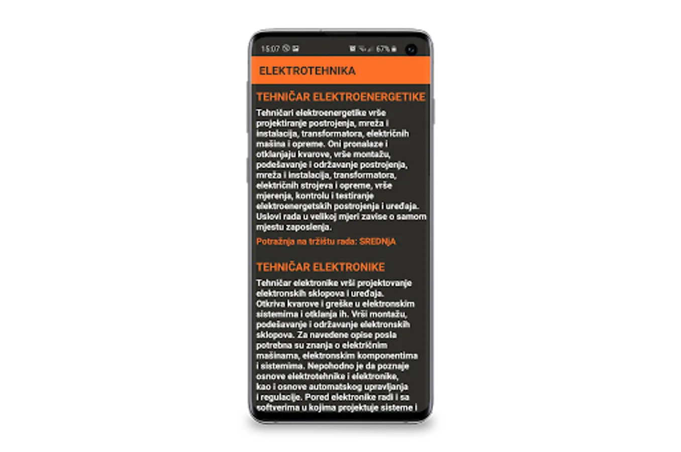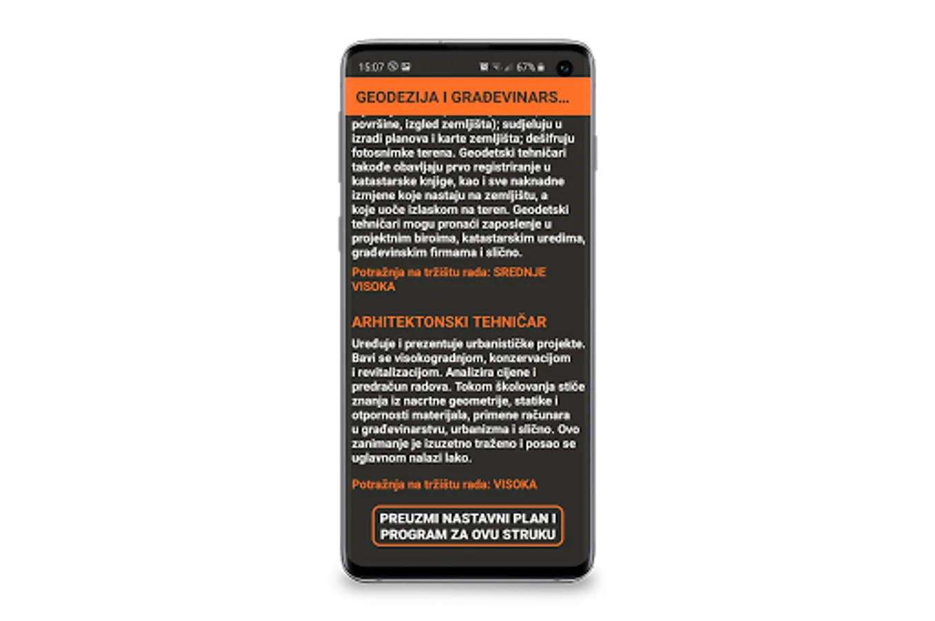 U aplikaciji se nalaze detaljni opisi svih zanimanja koja se upisuju u Republici Srpskoj, tako učenici imaju uvid u zanimanja koja im stoje na raspolaganju. Pored opisa zanimanja, učenici mogu pronaći i oblasti sa kojima će se susretati tokom školovanja.