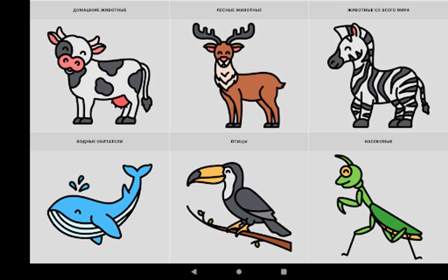 The "Animals for Toddlers" application is a fascinating guide to the world of animals, marine life, birds and insects for your child. At the moment, the collection of the application has 87 different animals in four categories: