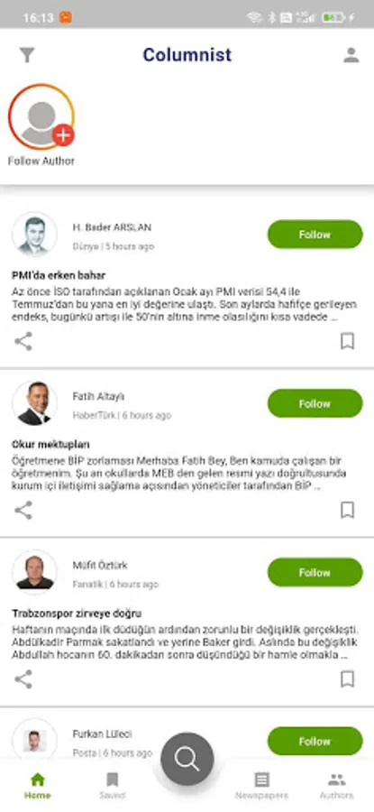Search - Discover: On this screen, you can access the columns, columnists and newspapers under one roof in one framework with a different user experience. Also, thanks to the search feature, you can reach the relevant columnists and columns very easily.