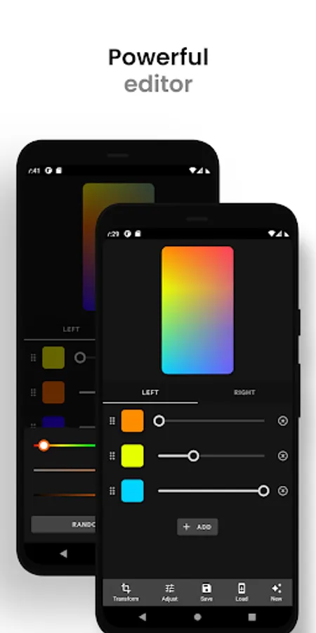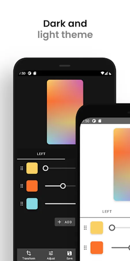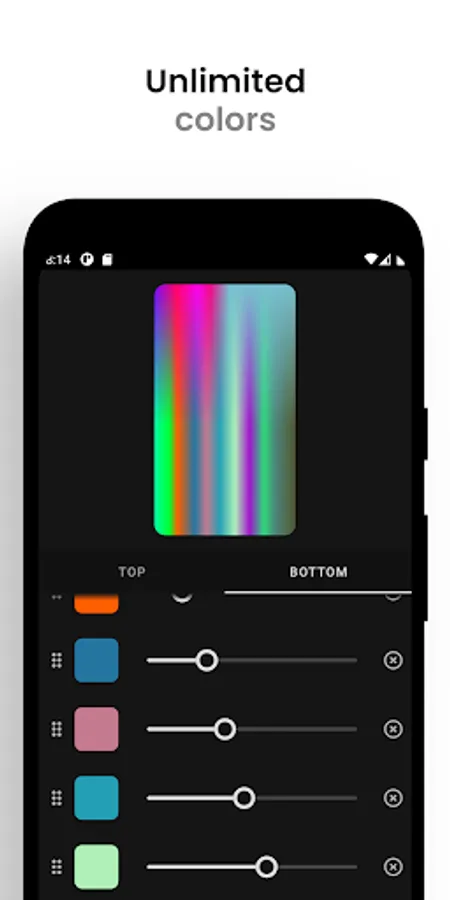 An advanced editor allows for unlimited creativity. You can adjust single colors or entire wallpapers at once, add as many colors as you like, and switch and rotate gradients.
