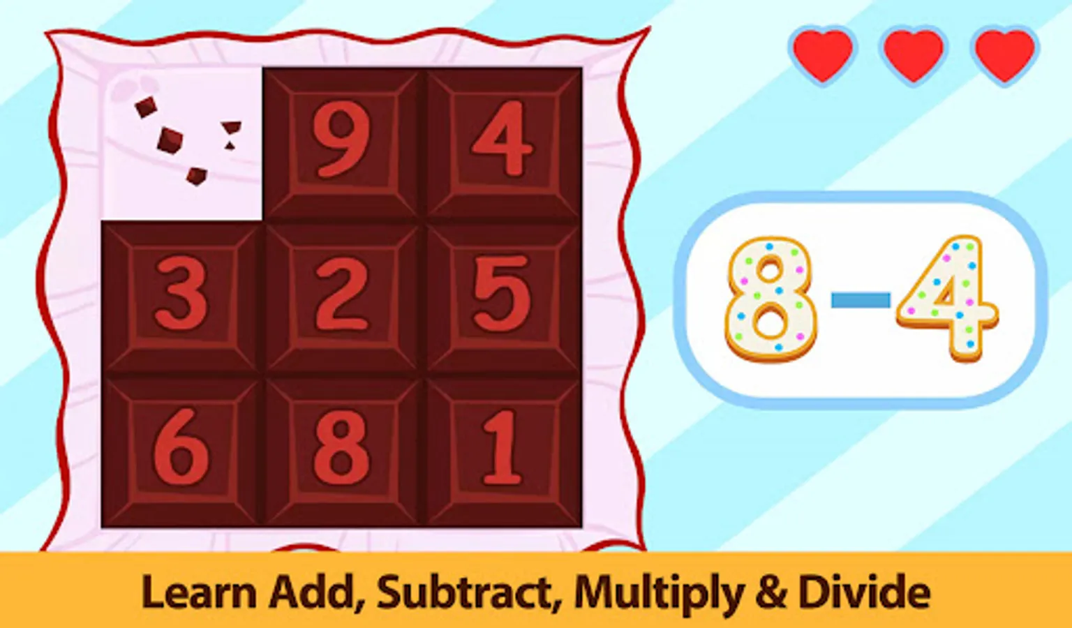 Test their basic math knowledge with some basic math operation challenges with 2 different kids math games. The first one is where the math challenge is on the right, while they need to guess the correct answer on the chocolate on the left which is filled with numbers. They have 3 lives (they lose a life for each incorrect answer). The other math learn numbers game involves calculations with cookies and choosing the correct answer.