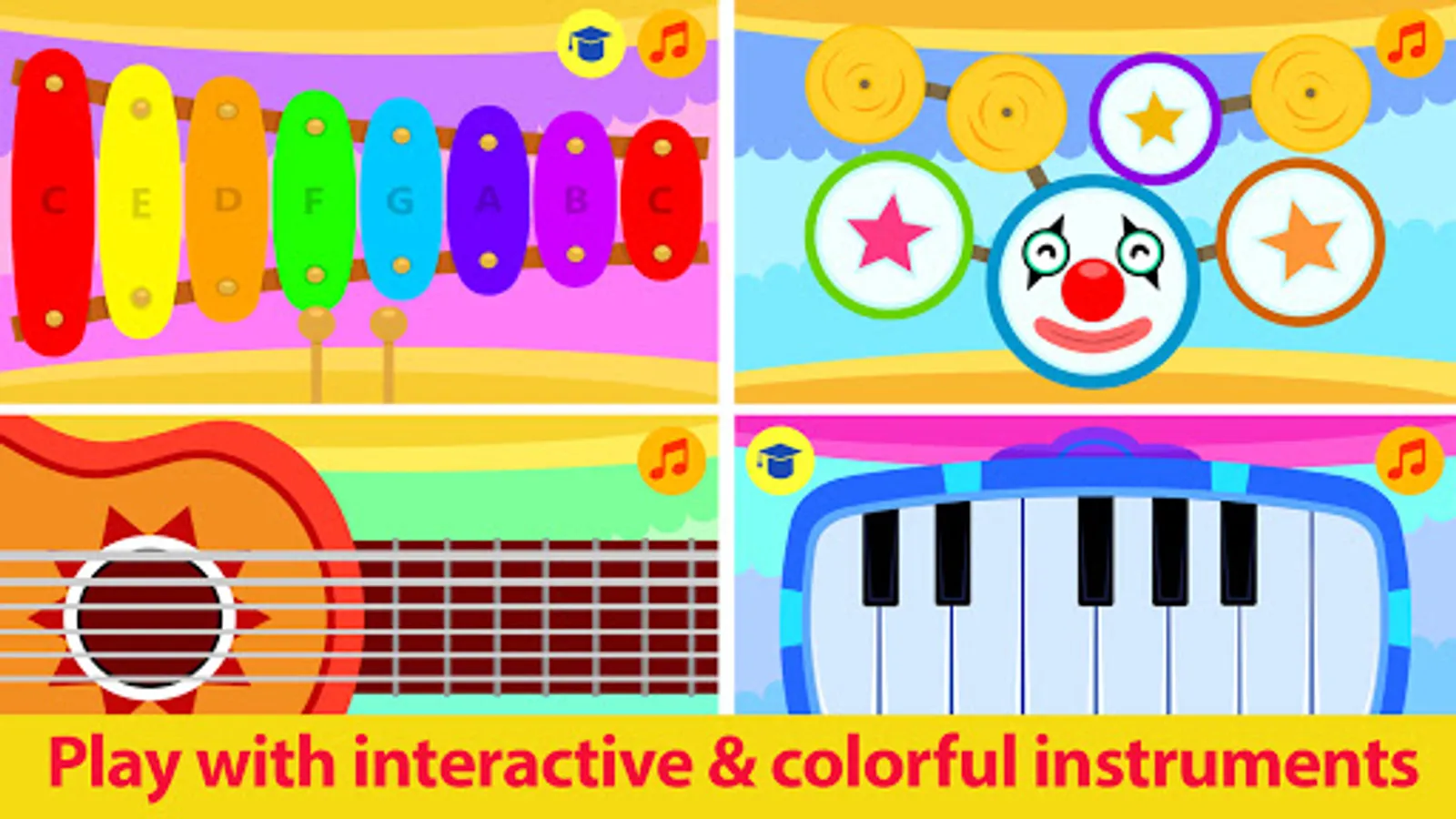 Play from a set of musical instruments such as piano, drums, xylophone, guitar. Listen to sounds from these musical instruments as you play them on your phone.