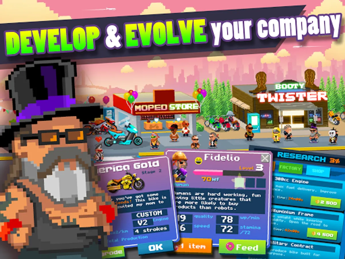 Produce uncommon motorcycles, make up unique models, make your workers happy, build and upgrade your shops, please demanding clients, and challenge your friends in races!