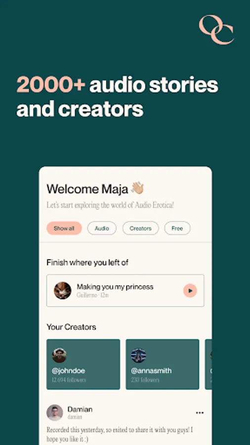 Our platform is designed to help creators monetize their skills and connect with an engaged audience who appreciates their talent. And for users, our app offers a treasure trove of captivating stories and voices to help you find your inner calm and explore uncharted territories.
