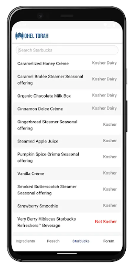 3. Kosher Starbucks - kosher status of all Starbucks drinks and products.