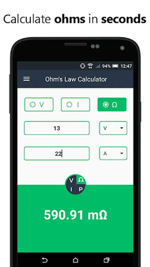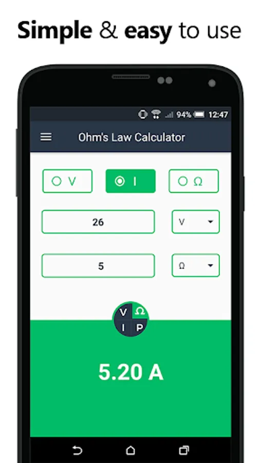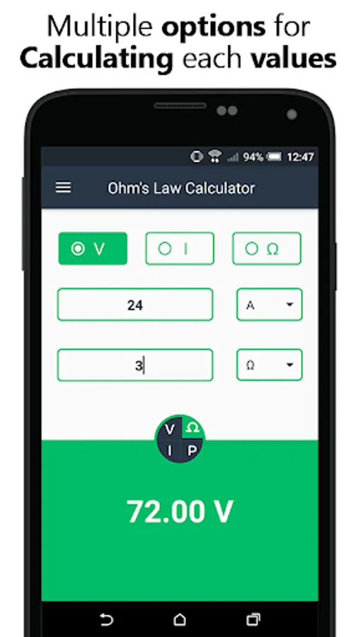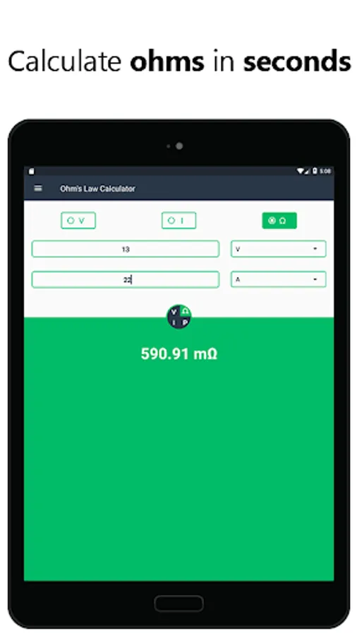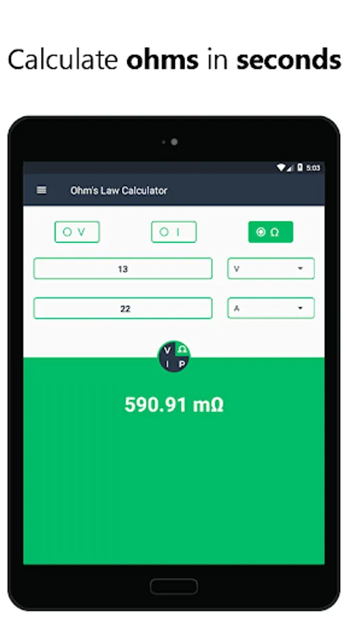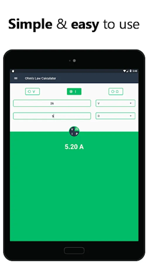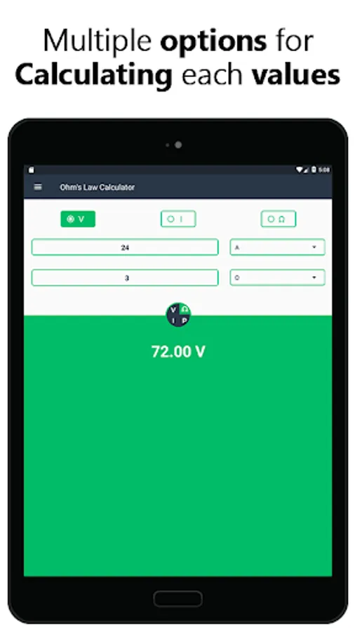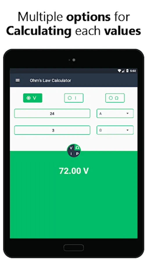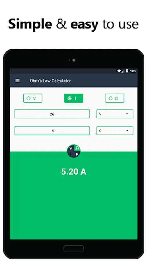 Ohms Law Calculator app is user-friendly with very simple interface, by entering two values, you will find real time answer within zero seconds. Along with values, each value have different units. Besides that there are three values voltage, current and resistance.