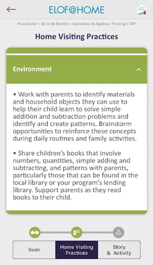 The ELOF@Home is a mobile solution for home visitors who want to access, and learn more about, the Head Start Early Learning Outcomes Framework (HS ELOF). The app provides on-the-go access to the ELOF goals for children and effective practices for home visitors in support of those goals.