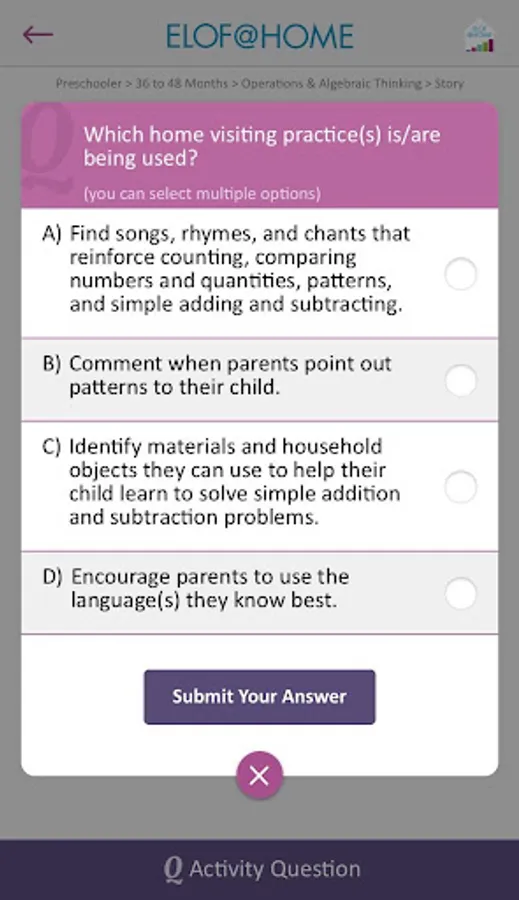 The ELOF@HOME app should be used by directors, managers, and home visitors, working in home-based programs as their mobile ELOF. The ELOF@HOME app incorporates practices that are effective at promoting strong parent-child relationships, positive parenting, and children’s growth and development within the ELOF domains.