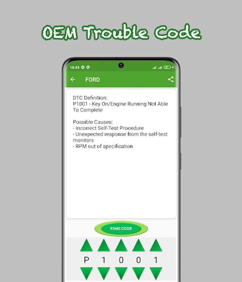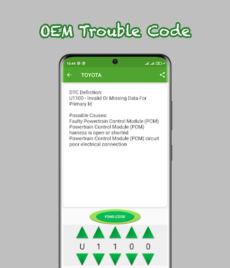 * Select vehicle -> Input code -> Press find button -> See definition and possible causes.