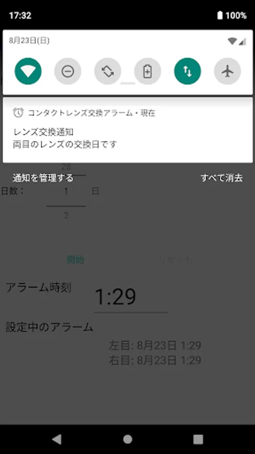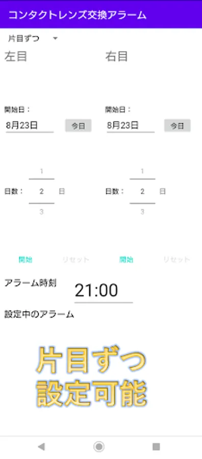 コンタクトレンズの交換日を自由に設定でき、終了日に通知します。両目同時はもちろん、片目ずつ設定することもできます。また、装着日数も設定できます。2週間より早い周期で変えたい方も、安心してご使用いただけます。