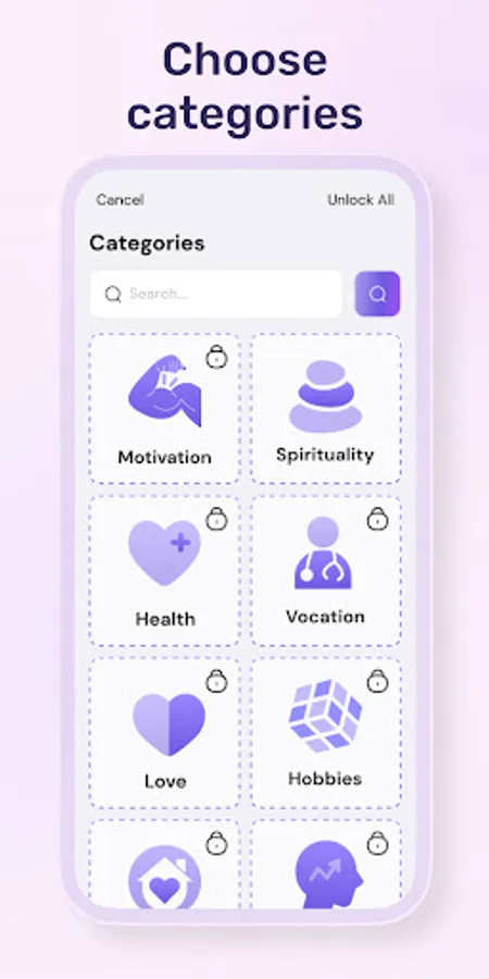 Upon opening the app, users are prompted to select from a list of categories such as anxiety, stress, self-esteem, and motivation. Once a category is selected, the app provides a list of affirmations and motivational messages tailored to that specific category. These messages are designed to help users stay positive and focused throughout the day, providing a boost of motivation when needed.