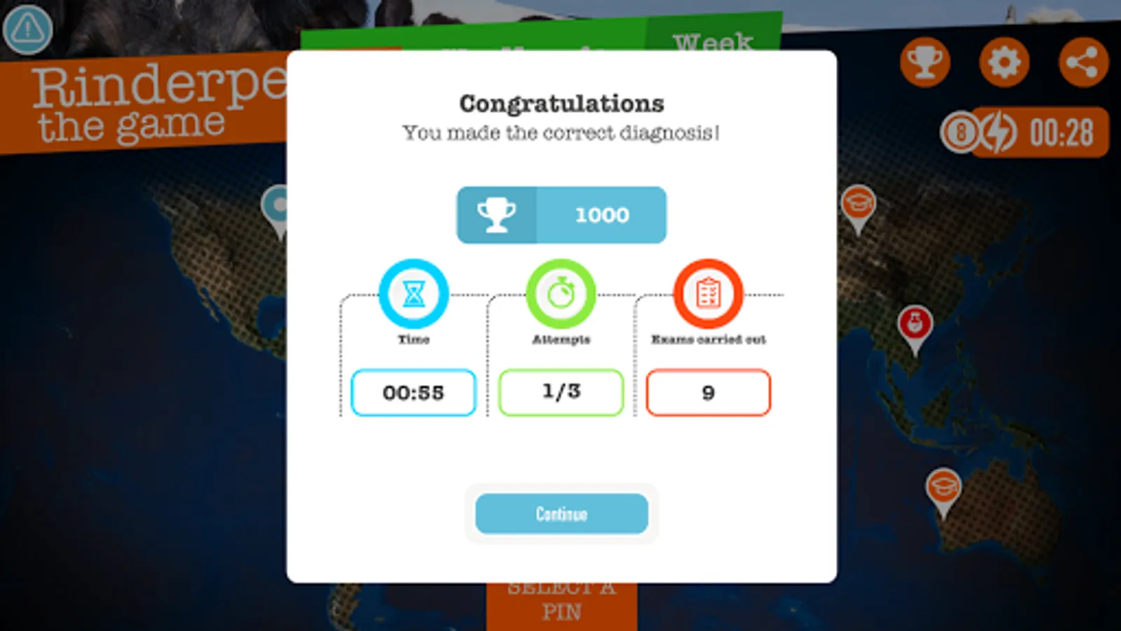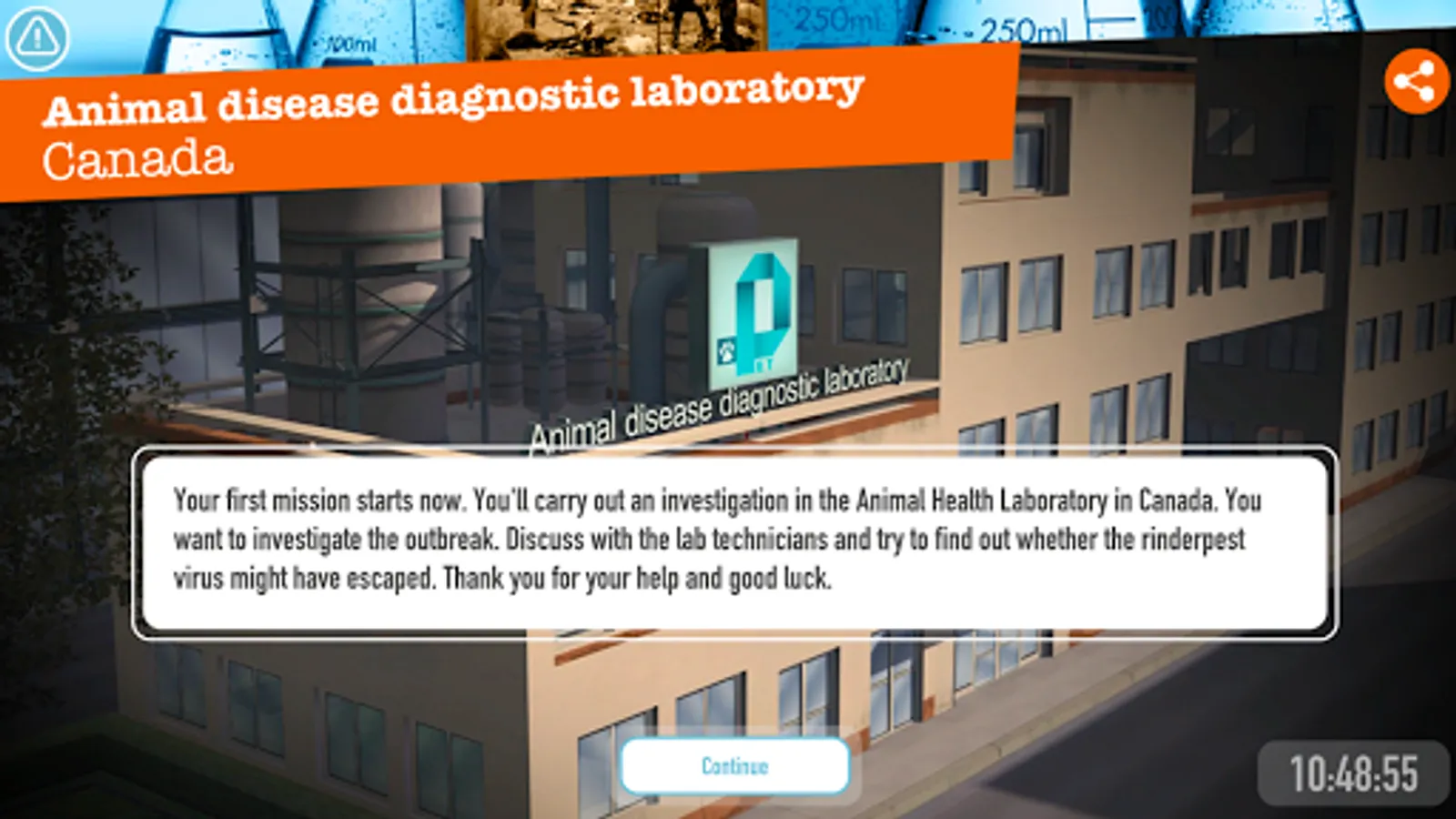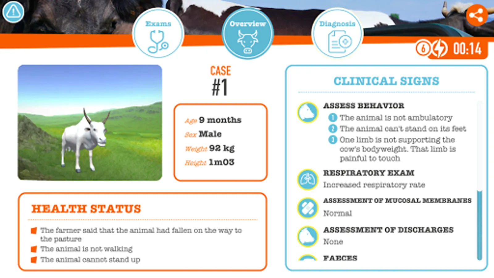 Players will be both in the shoes of a veterinarian and of a laboratory technician. As a veterinarian, the player will have to detect rinderpest among other similar diseases or not-so-similar pathologies (distractors). To start the game, the player will have to choose a suspect disease case that has been found somewhere in the world and then undertake differential diagnoses based on clinical signs, often shared with rinderpest. Once the examination is done, the player will make a tentative diagnosis that will be validated. If it is wrong, the player will have to further investigate to find the correct diagnosis.