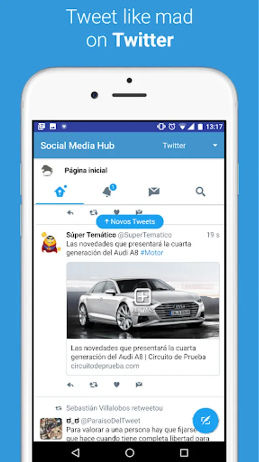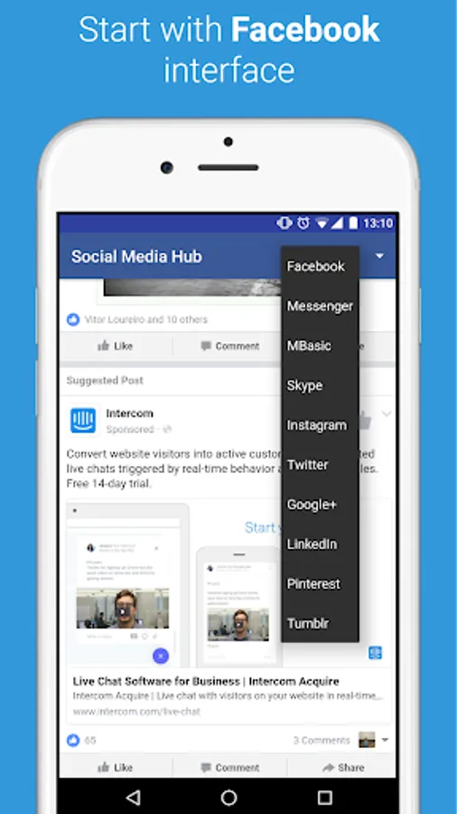 Access directly to Facebook™ (also Facebook Messenger™ and Facebook Lite™), Twitter™, Instagram™, Google+™, Pinterest™, Tumblr™, LinkedIn™, Skype™, Hangouts™ platforms just like you where in the official Apps.