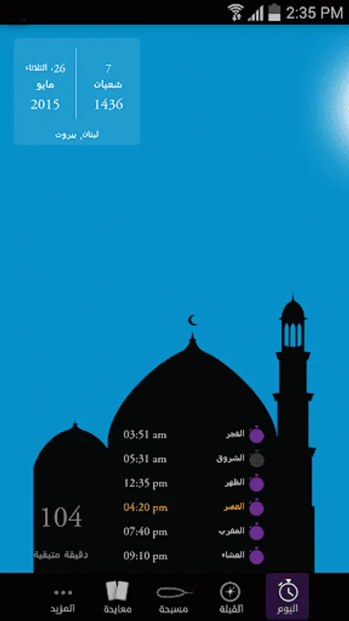 - التطبيق يعرض الوقت المتبقي للصلاة القادمة