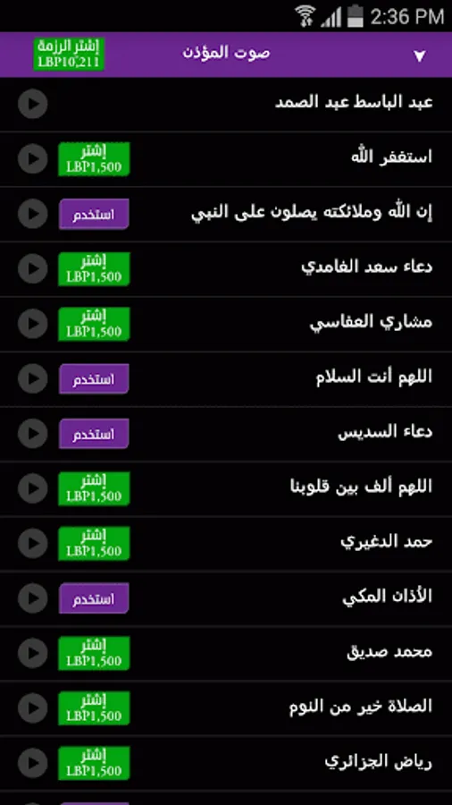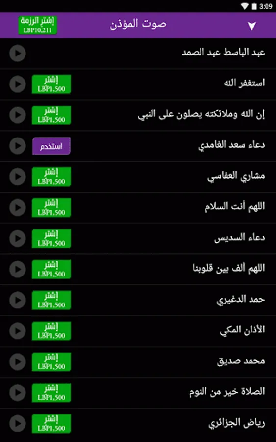 - متجر الصوت: حيث يمكنك شراء بعض أصوات الأذان وإستعمالها كمنبه في التطبيق
