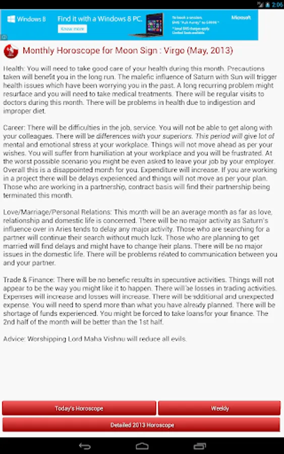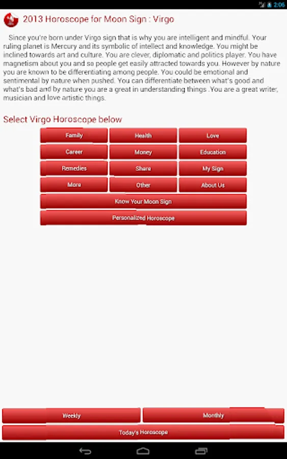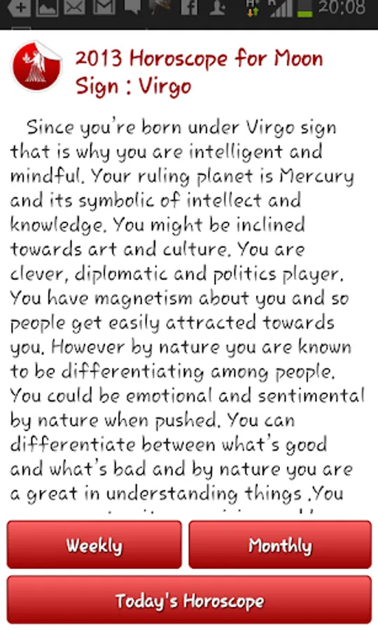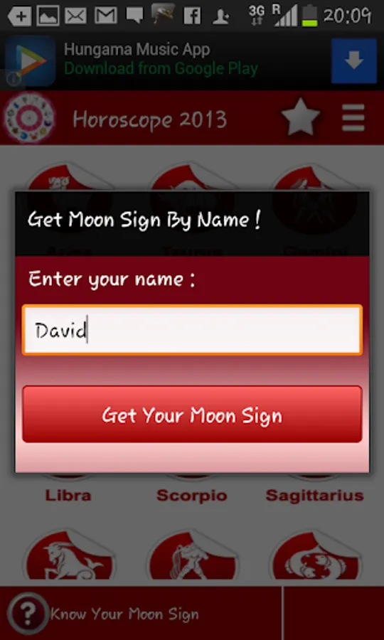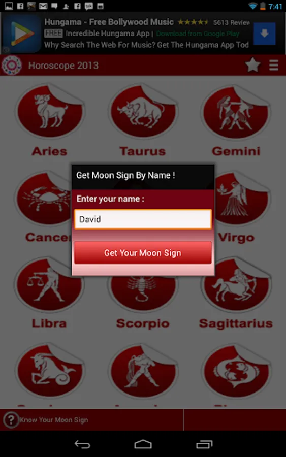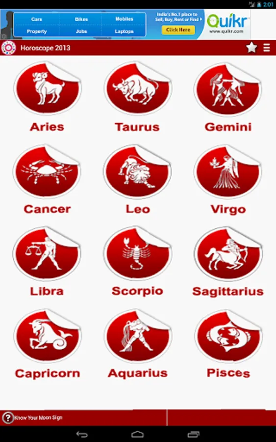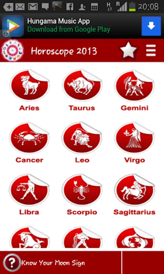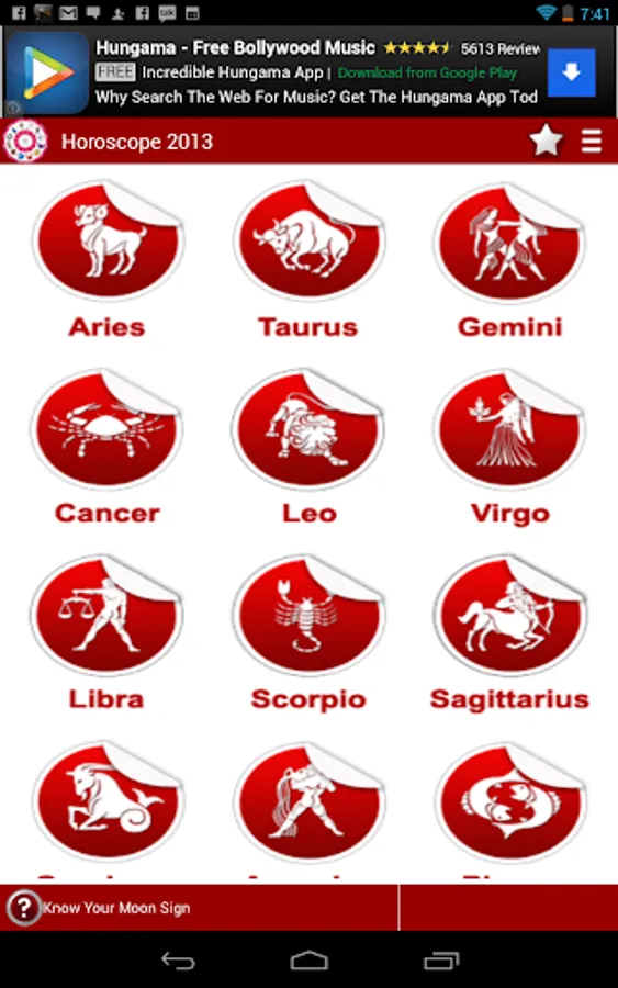 Select from your zodiac sign Aries, Taurus, Gemini, Cancer, Leo, Virgo, Libra, Scorpio, Sagittarius, Capricorn, Aquarius, and Pisces. All horoscopes are based on Vedic astrology Moon Signs and if you do not know your moon sign, no worries, app will find it out for you.
