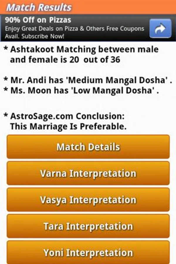 As the name suggests, maximum possible points are 36. If a matching obtains less than 18 points, it is not considered good and marriage is not advisable. Apart from 36 Points, this App also considers Mangal Dosha (Manglik Dosha or Kuja Dosham) compatibility and pronounces results by combining these two important factors. This app also gives you detailed interpretation of Nadi Dosha, Bhakoot Dosha and some other important factors that needs to be considered in Vedic astrology.