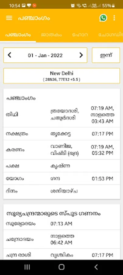 Malayalam Calendar 2022 app gives a precise detail about sunrise/sunset time, moonrise/moonset time, Nakshatram, Tithi, Gulika Kalam, Yamaganda Kalam, Rahu Kalam etc. Through this Panchangam, you can also see the Choghadiya and Hora chart for day and night along with the planetary positions in the Kundali.