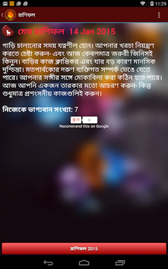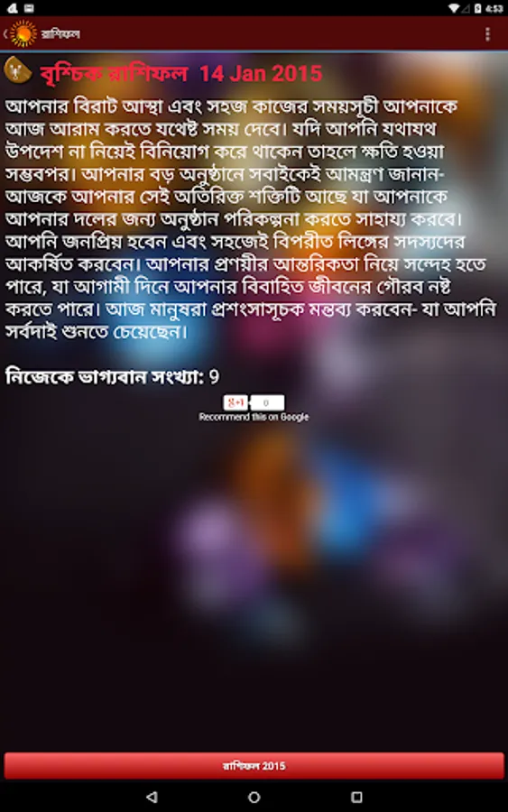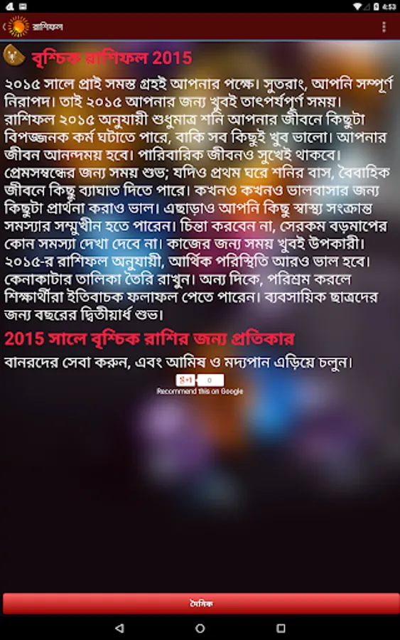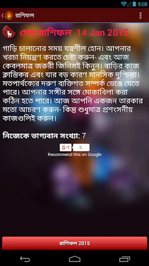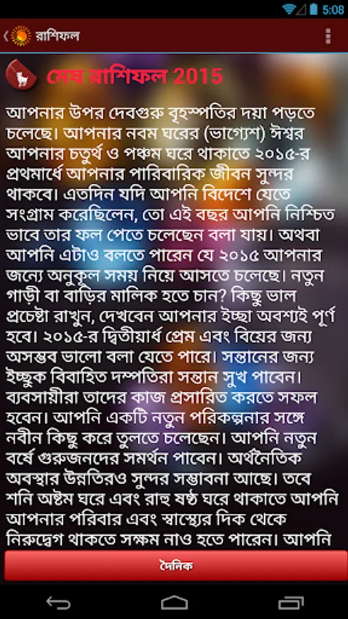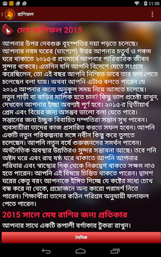 This application রাশিফল (Rashifal in Bengali) is based on the principles of Vedic Astrology. Our “Bangla Rashifal” tells you how each day is going to be for you from different perspectives such as love, family, finance, success and prosperity etc. The daily horoscope in Bengali given here will help you prepare better for the day and help you get most out of it. Other than daily Bengali horoscope, yearly horoscope i.e. Bangla Rashifal 2020 is also available here for all zodiac signs. You may read our today’s horoscope in Bengali to avoid potholes and tread the path without difficulties. Today’s Bengali horoscope given here is prepared by our astute astrologers to give you best of astrological suggestions every day.