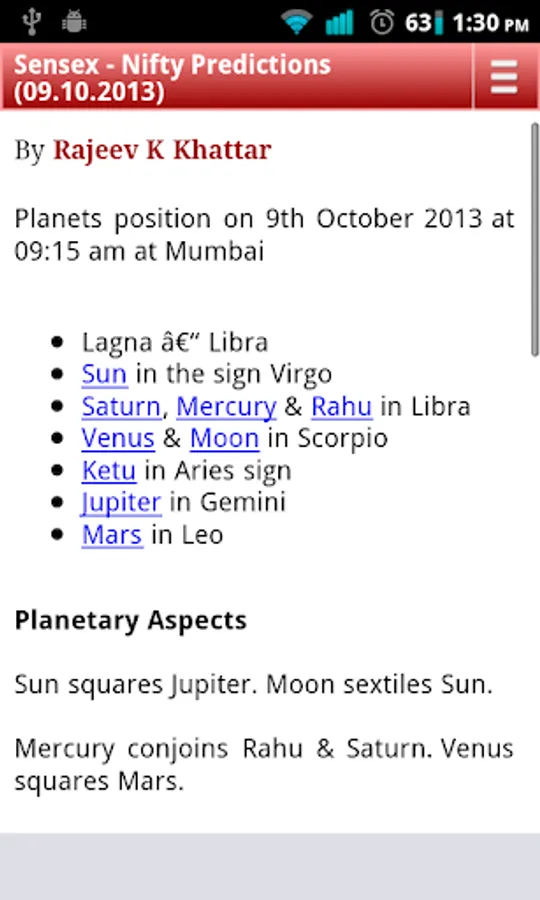 You will come to know daily nifty movements in this app. We combine astrological techniques with technical analysis to understand and forecast the daily movements of S&P CNX NIFTY and SENSEX. We not only predict India stocks but also Indian futures and options. We also cover Commodities Market Trends along with nifty trends in this app by AstroSage.com